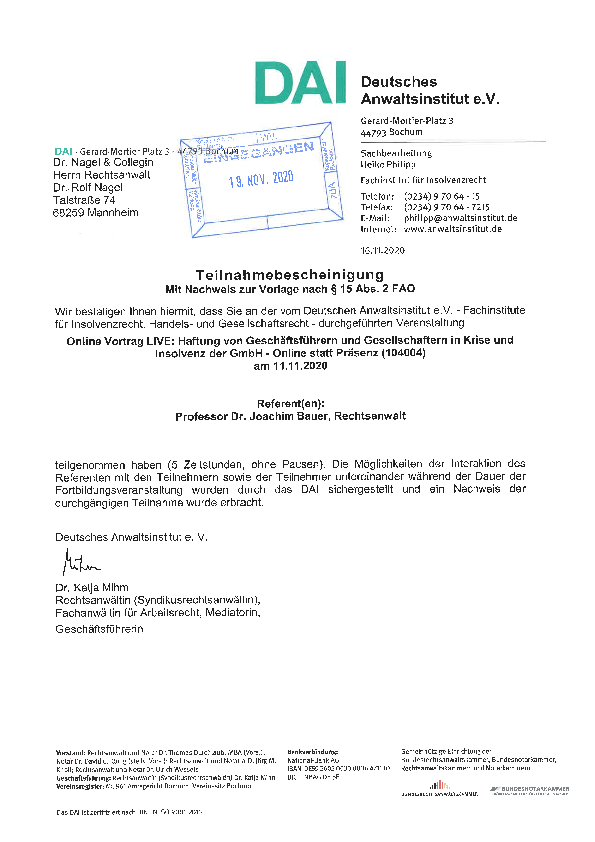 - Haftung von Geschäftsführern und Gesellschaftern in Krise und Insolvenz der GmbH (Online Vortrag / November 2020)